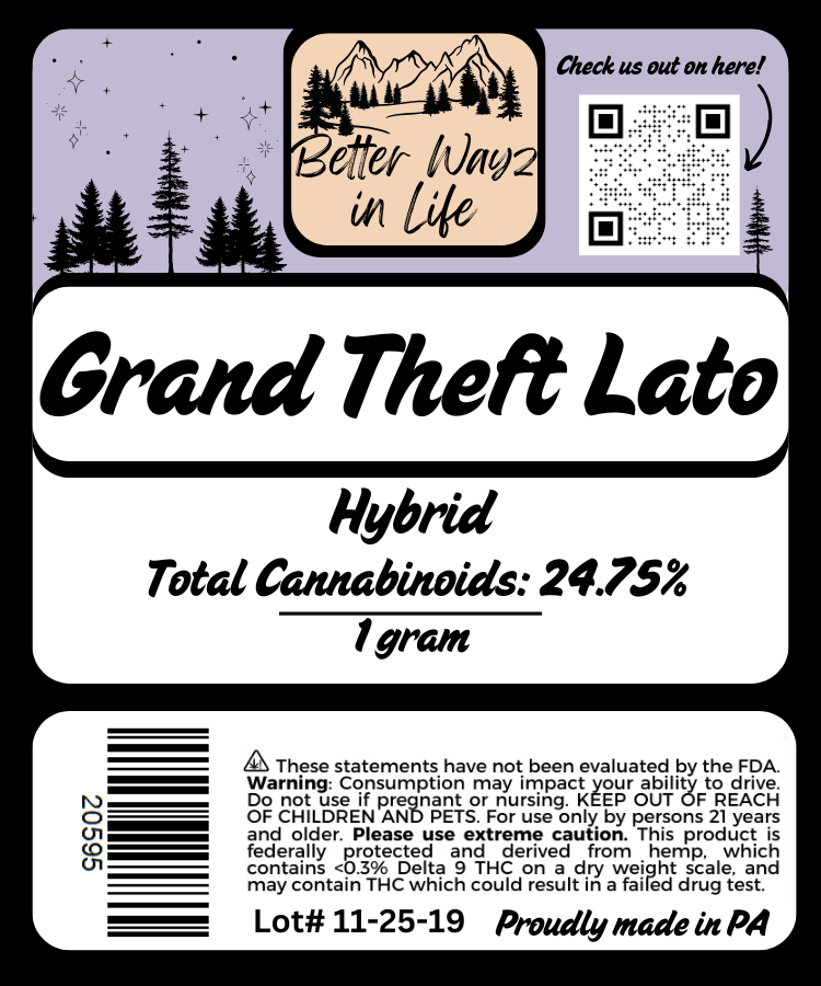 Grand Theft Lato is a bold hybrid that blends mental uplift with a smooth, grounded body feel. This premium indoor THCa flower is grown for potency and purity, offering a balanced experience that fits a wide range of moods.